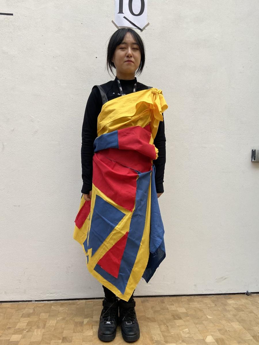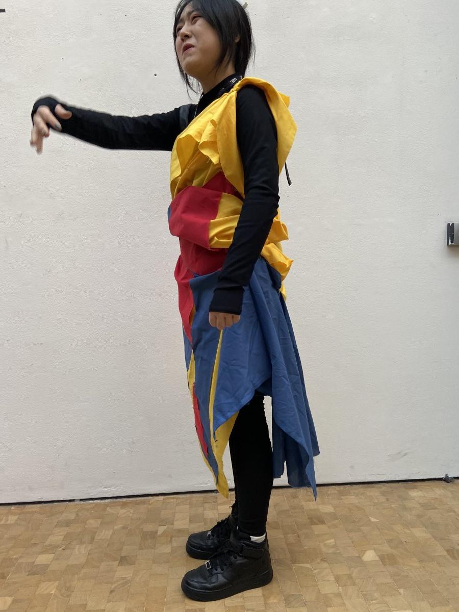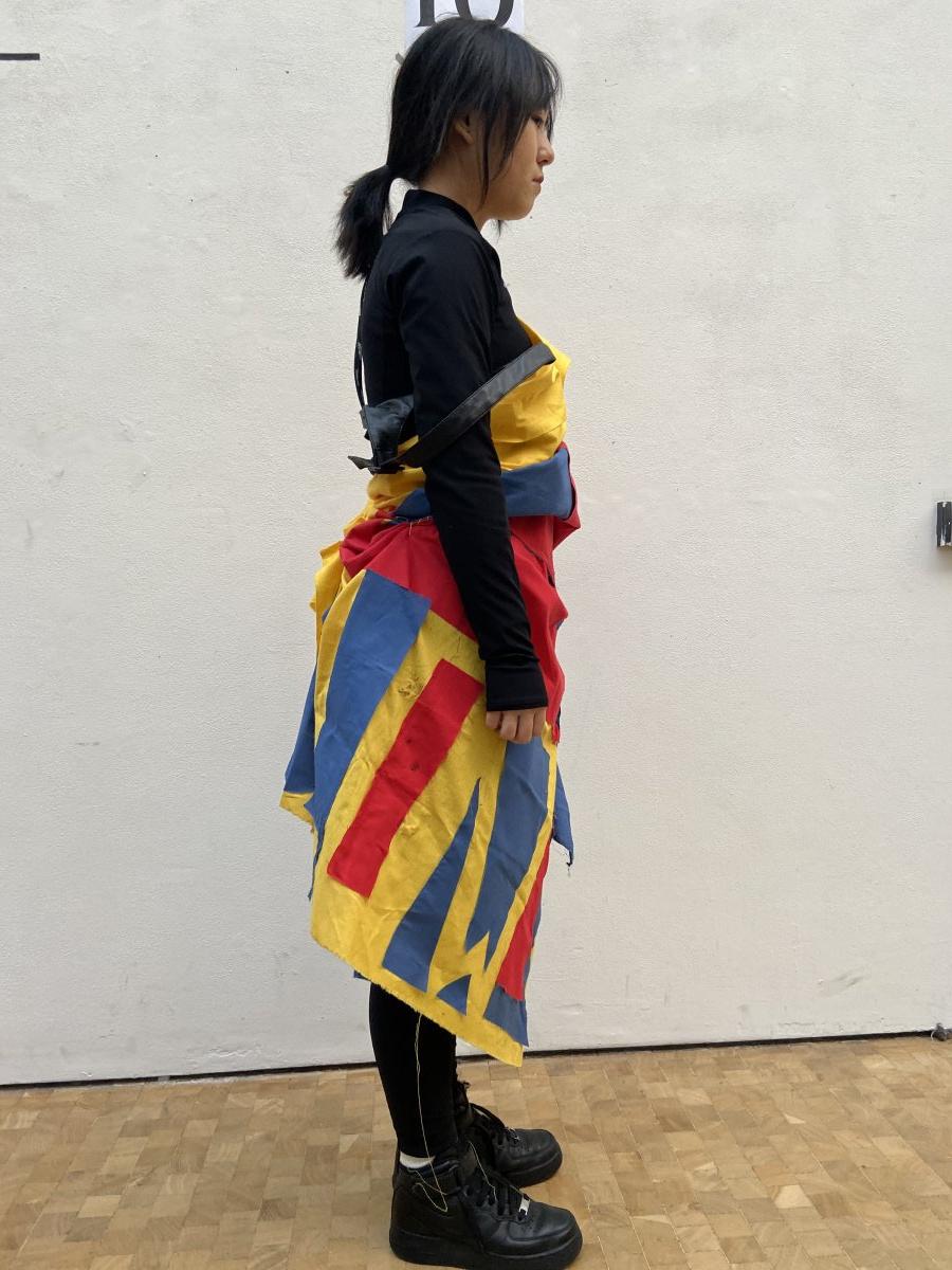 I decided it in the moment I saw the size of the fabric that I will have to use additional fabric. which I want to support my print out fabric for it to stand out and catch the eyes. I chose magenta because I feel that it had some connection with their colour but when I drape it. it turns out that I might be wrong because I feel the main character is not my print out garment. it turned out that magenta is the main.